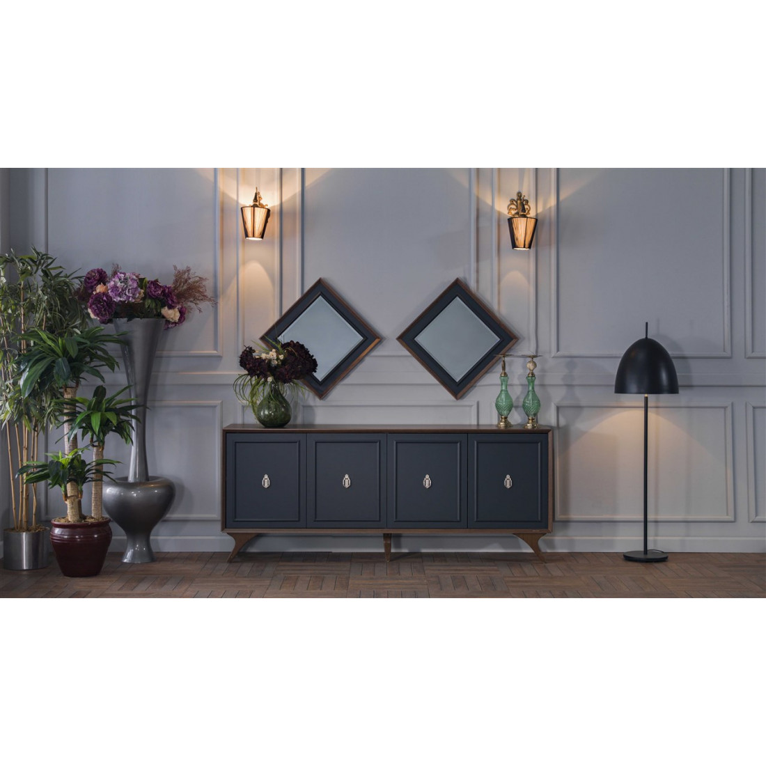 Длинный комод для посуды в гостиную ALEG-10 серии Алегро от Беллона средней высоты (840) станет прекрасным, многофункциональным дополнением интерьера гостиной и столовой. Ажурные ручки образуют единый декоративный элемент, сходясь в центре фасадов. В качестве материала для фасадов, столешницы и ножек использовался МДФ.