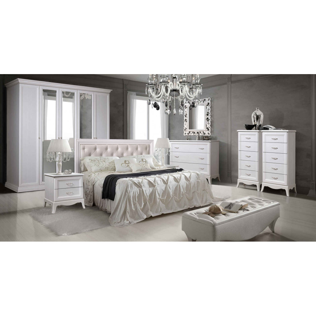 Спальня изготовлена из высококачественного ЛДСП класса Евро-1 с декором из МДФ. Ножки на тумбочках, комодах, однодверных и двухдверных шкафах сделаны из ППУ, произведенных в Италии. Двери шкафа и шуфляды комода, а также тумбочек открываются за счет бесшумных петель и направляющих фирмы «Hettich» (Германия) и «Hafele» (Германия).