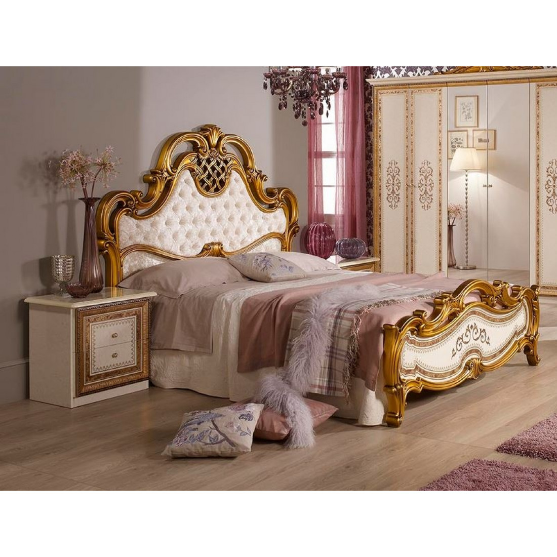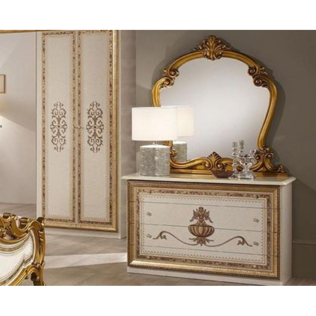 Спальня Анита (беж) от Российской фабрики «ДИА мебель» Выполнена в бежевом цвете с отделкой золотых фасадов. Классический стиль придают интерьеру неповторимую уникальность и роскошь. Изгибающие линии кровати и зеркала придают легкость и воздушность спальне. Коллекция "Анита" придаст вашей спальне экстравагантность и принесет свежие нотки в Ваш дом.