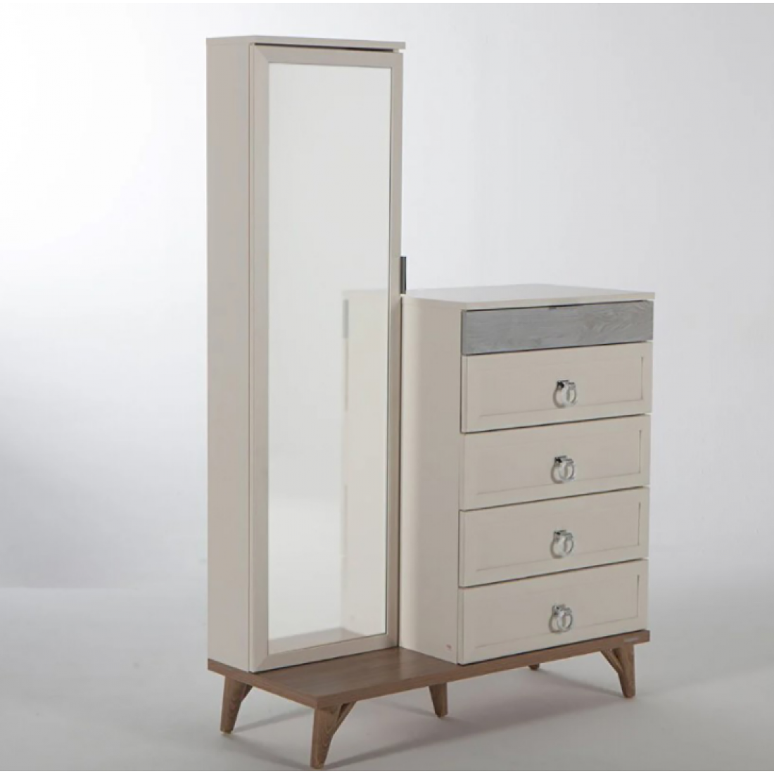 Туалетный комод с ящиками и зеркальным шкафом с полками из серии Мавенна. Верхний ящик предназначен для хранения ювелирных изделий. Цвет бежевый/ серый. Изготовлен из ЛДСП высокого качества.