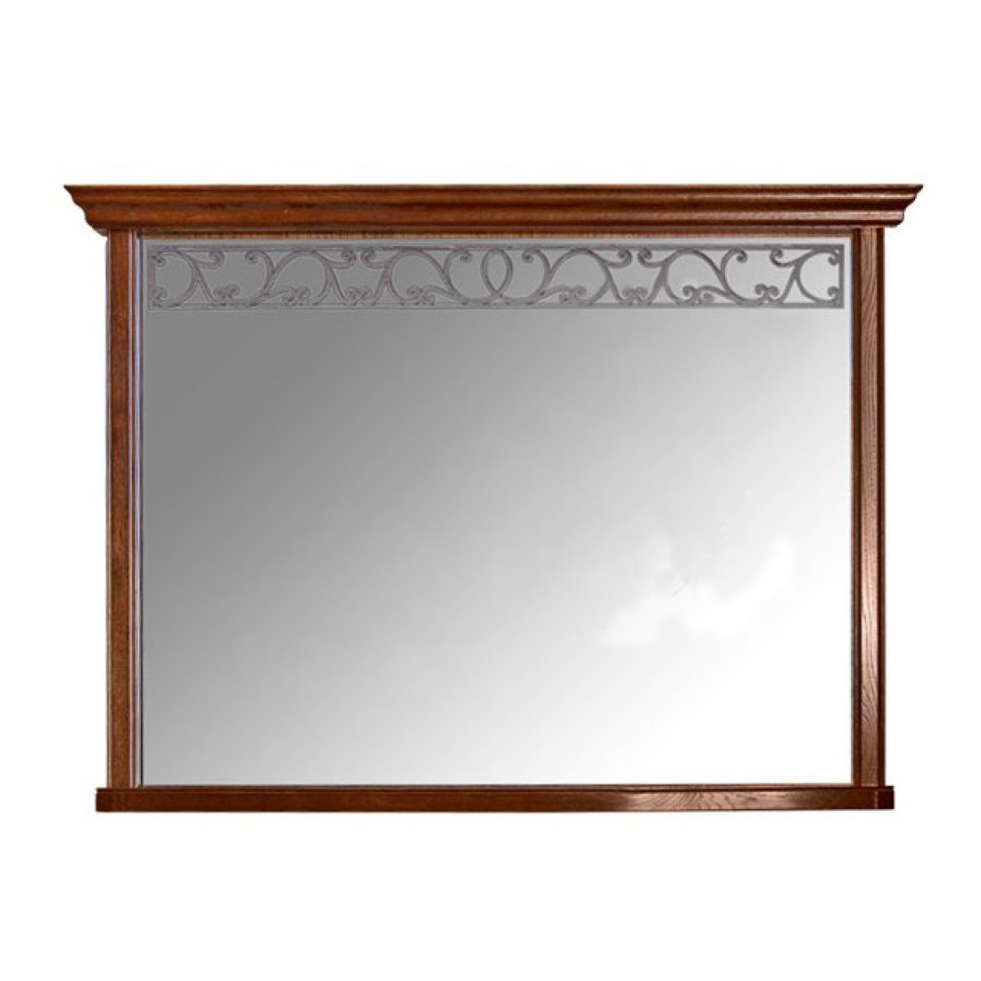 Классическое прямоугольное зеркало в раме из массива дуба из коллекции "Оскар". Декорировано высоким карнизом, фацетом и лазерной гравировкой на поверхности зеркала. Крепится на стену.